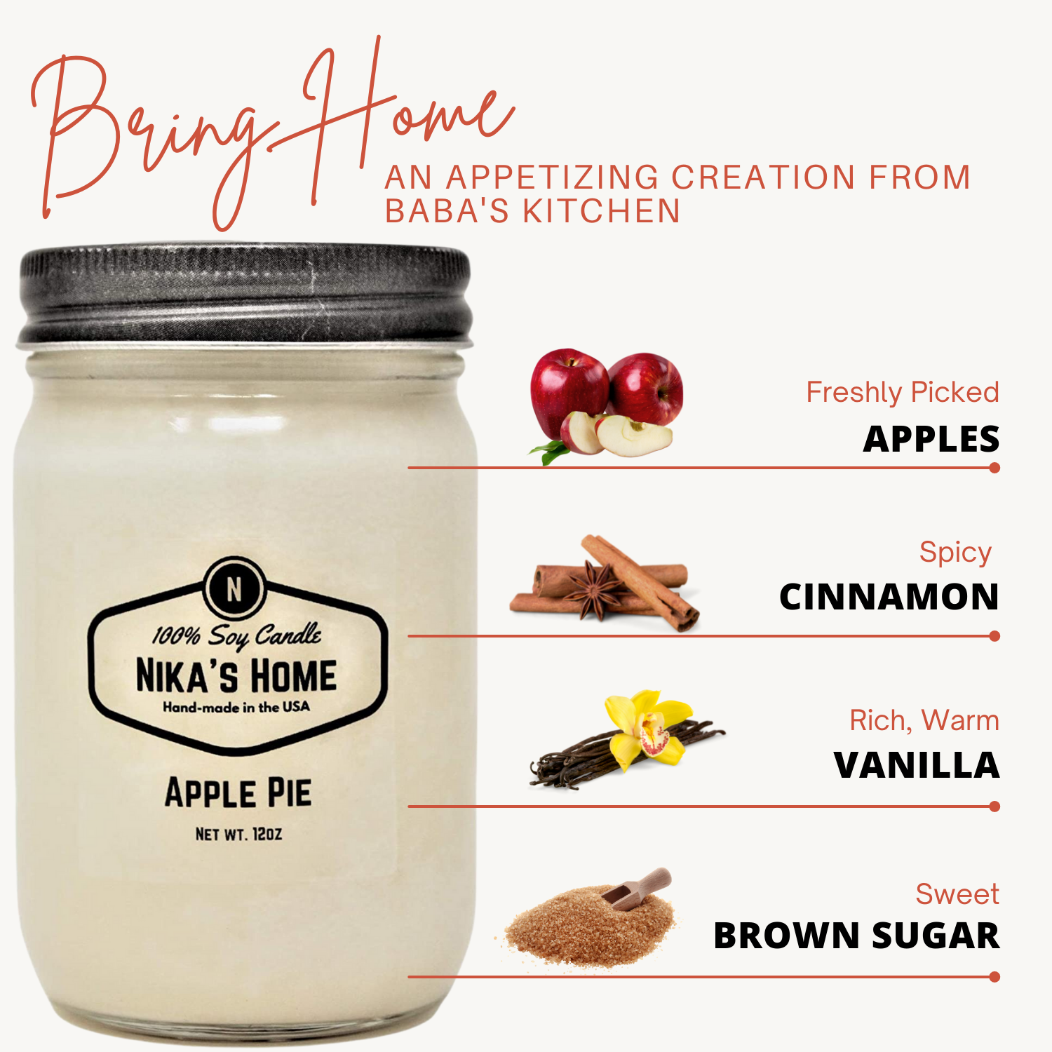 Bring HOME an appetizing creation from Baba's kitchen. It is a sweet and spicy scent of carefully selected and freshly picked apples, cinnamon and brown sugar dusted then baked into a hand rolled flaky pie crust.
